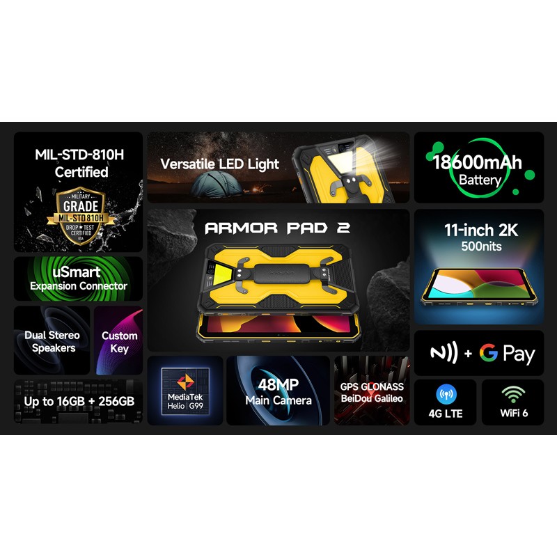 Στιβαρό και αδιάβροχο (IP68/IP69K/MIL-STD-810H) tablet της Ulefone, με επιβλητικό design και σκελετό υψηλής ποιότητας, ανθεκτικό σε σκληρή χρήση. Διαθέτει μεγάλη οθόνη 11" και ισχυρό οκταπύρηνο επεξεργαστή που σε συνδυασμό με το λειτουργικό Android 13, απογειώνουν την απόδοση του tablet.